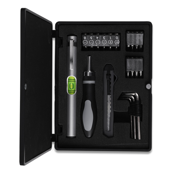 Wieloelementowy zestaw narzędzi w pudełku zamykanym na magnes. Zawiera: poziomicę z uchwytem (1/4”), uchwyt wkrętakowy (4 mm) z grzechotką, magnetyczny, wkrętak PHO (krzyżowy), – 2 rozmiary (1/4”), wkrętak płaski (1/4”) – 4 rozmiary, nóż tapicerski, wkrętak płaski – 4 rozmiary (4 mm), wkrętak PH (krzyżowy) – 4 rozmiary (4 mm), klucz imbusowy – 3 rozmiary.