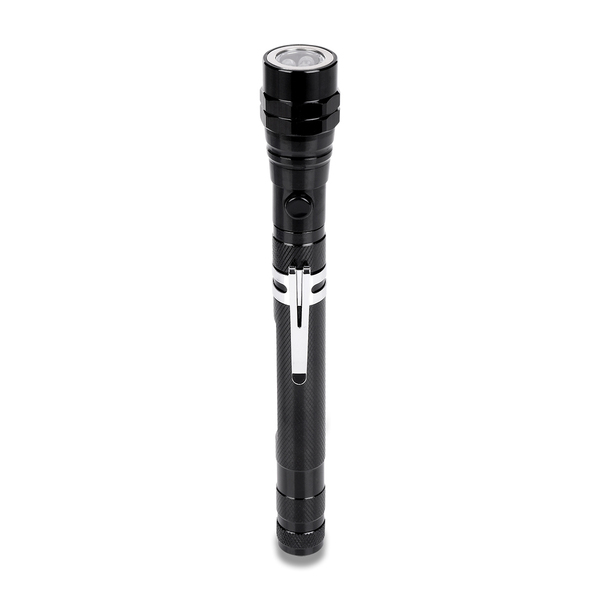Metalowa wysuwana latarka. Teleskop o długości 38,5 centymetrach Wyposażona w 3 białe diody LED, o sumarycznym strumieniu światła 10 lumenów. Zaopatrzona w klips oraz magnesy na obu końcach. Zasilana 4 bateriami typu AG13 (w cenie produktu).